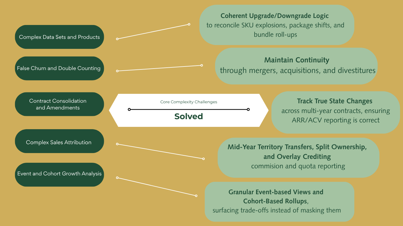 Off-the-shelf SaaS tools oversimplify complex realities. Their rigid models can’t adapt to mergers, product changes, or custom contracts. Often leaving ARR, GAAP, and bookings out of sync. We solve that with a flexible, reconciliation-ready BI platform that adapts to your business, not the other way around.